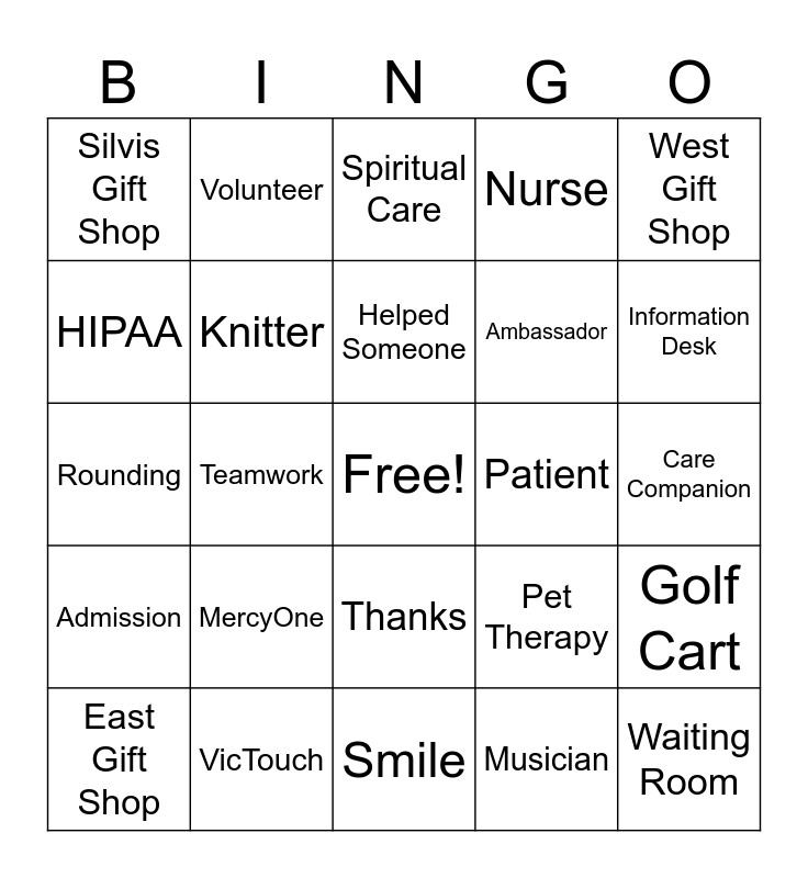 This bingo card has a free space and 24 words: MercyOne, VicTouch, Helped Someone, East Gift Shop, West Gift Shop, Silvis Gift Shop, HIPAA, Volunteer, Patient, Thanks, Ambassador, Rounding, Pet Therapy, Golf Cart, Knitter, Musician, Care Companion, Spiritual Care, Information Desk, Teamwork, Waiting Room, Admission, Nurse and Smile.