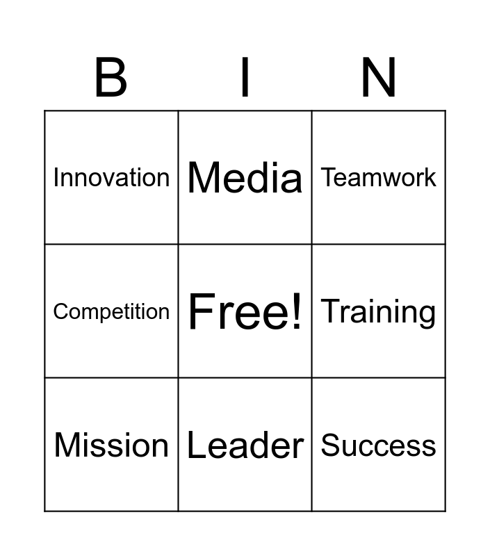 This bingo card has a free space and 10 words: Leader, Teamwork, Innovation, Success, Competition, Mission, Media, Start-up, Training and Profit.