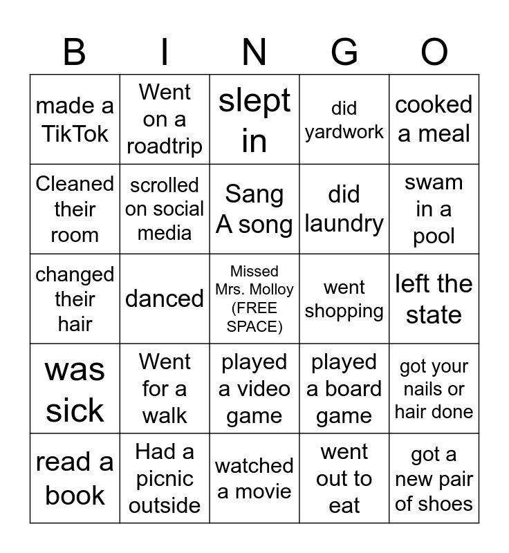 This bingo card has a free space and 24 words: Went for a walk, Had a picnic outside, Sang A song, read a book, cooked a meal, made a TikTok, Cleaned their room, Went on a roadtrip, went shopping, played a video game, did laundry, changed their hair, played a board game, got your nails or hair done, scrolled on social media, went out to eat, left the state, slept in, swam in a pool, danced, got a new pair of shoes, was sick, did yardwork and watched a movie.