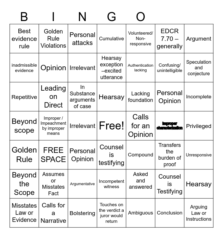 This bingo card has a free space and 48 words: Asked and answered, Confusing/ unintelligible, Touches on the verdict a juror would return, Improper / Impeachment by improper means, In Substance arguments of case, Privileged, Golden Rule Violations, Calls for a Narrative, EDCR 7.70 – generally, Counsel is testifying, Argument, Cumulative, Personal Opinion, Lacking foundation, Beyond the Scope, Improper characterization, inadmissible evidence, Speculation and conjecture, Counsel is Testifying, Volunteered/ Non-responsive, Authentication lacking, Irrelevant, Best evidence rule, Opinion, Hearsay, Irrelevant, Incomplete, Misstates Law or Evidence, Hearsay, Leading on Direct, Conclusion, Calls for an Opinion, Unresponsive, Assumes or Misstates Fact, Beyond scope, Compound, Transfers the burden of proof, Repetitive, Personal Opinion, Argumentative, Golden Rule, Arguing Law or Instructions, Personal attacks, Bolstering, Hearsay exception –excited utterance, Incompetent witness, FREE SPACE and Ambiguous.