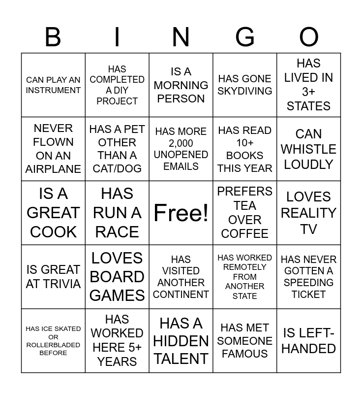 This bingo card has a free space and 30 words: HAS WORKED HERE 5+ YEARS, SPEAKS MORE THAN 2 LANGUAGES, HAS RUN A RACE, LOVES SPICY FOOD, CAN PLAY AN INSTRUMENT, IS A MORNING PERSON, HAS A PET OTHER THAN A CAT/DOG, HAS VISITED ANOTHER CONTINENT, PREFERS TEA OVER COFFEE, HAS A HIDDEN TALENT, LOVES REALITY TV, IS LEFT-HANDED, HAS MET SOMEONE FAMOUS, DOES NOT DRIVE, CAN WHISTLE LOUDLY, HAS A UNIQUE HOBBY, HAS WORKED REMOTELY FROM ANOTHER STATE, IS GREAT AT TRIVIA, LOVES BOARD GAMES, HAS LIVED IN 3+ STATES, IS A GREAT COOK, HAS NO SOCIAL MEDIA, HAS COMPLETED A DIY PROJECT, HAS READ 10+ BOOKS THIS YEAR, NEVER FLOWN ON AN AIRPLANE, HAS GONE SKYDIVING, HAS NEVER GOTTEN A SPEEDING TICKET, HAS ICE SKATED OR ROLLERBLADED BEFORE, HAS MORE 2,000 UNOPENED EMAILS and GETS 10,000 STEPS A DAY.