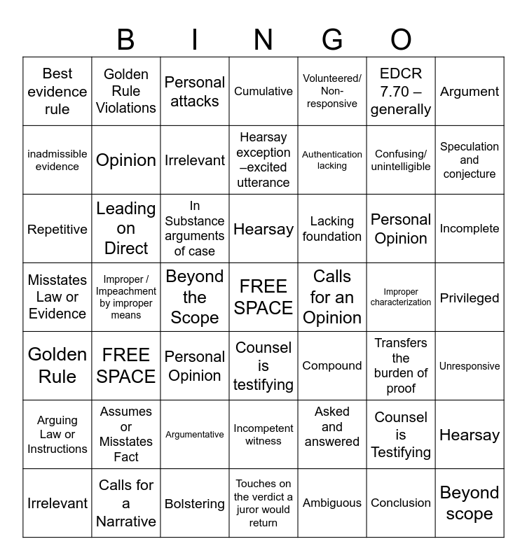 This bingo card has a free space and 48 words: Asked and answered, Confusing/ unintelligible, Touches on the verdict a juror would return, Improper / Impeachment by improper means, In Substance arguments of case, Privileged, Golden Rule Violations, Calls for a Narrative, EDCR 7.70 – generally, Counsel is testifying, Argument, Cumulative, Personal Opinion, Lacking foundation, Arguing Law or Instructions, Improper characterization, inadmissible evidence, Speculation and conjecture, Counsel is Testifying, Volunteered/ Non-responsive, Authentication lacking, Beyond the Scope, Best evidence rule, Opinion, Hearsay, Irrelevant, Incomplete, Irrelevant, Hearsay, Leading on Direct, Conclusion, Calls for an Opinion, Unresponsive, Assumes or Misstates Fact, Misstates Law or Evidence, Compound, Transfers the burden of proof, Repetitive, Personal Opinion, Argumentative, Golden Rule, Beyond scope, Personal attacks, Bolstering, Hearsay exception –excited utterance, Incompetent witness, FREE SPACE and Ambiguous.