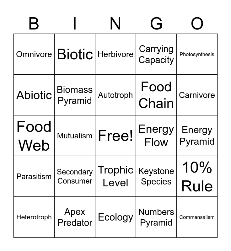 This bingo card has a free space and 24 words: Secondary Consumer, Apex Predator, Autotroph, Heterotroph, Photosynthesis, Omnivore, Abiotic, Biotic, Energy Flow, Trophic Level, Food Chain, Food Web, Keystone Species, 10% Rule, Biomass Pyramid, Numbers Pyramid, Energy Pyramid, Herbivore, Carnivore, Mutualism, Commensalism, Parasitism, Carrying Capacity and Ecology.