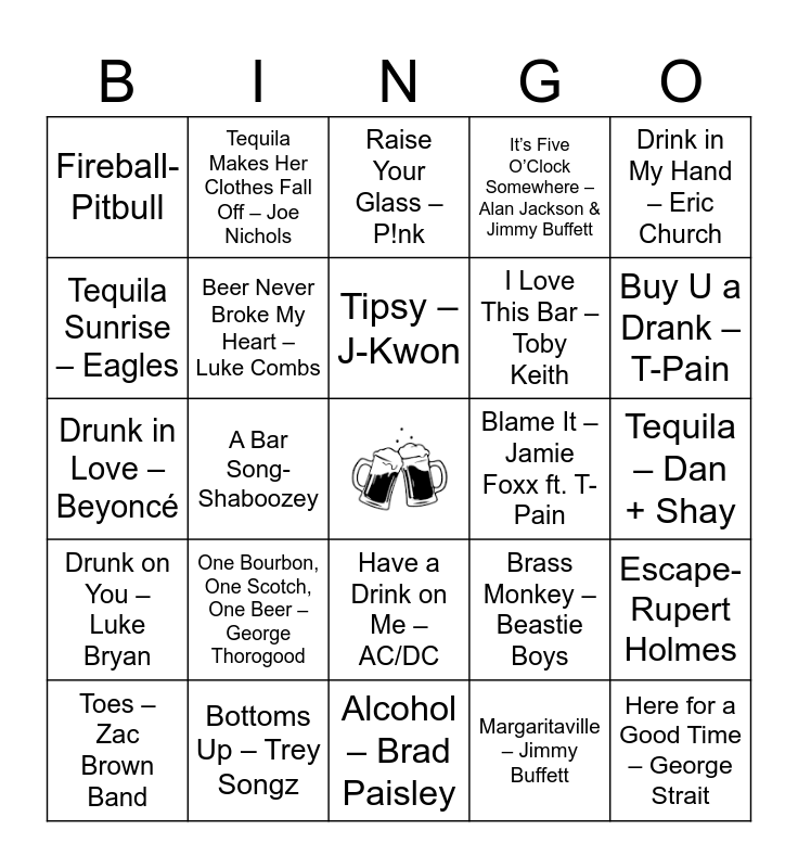 This bingo card has a free space and 34 words: Friends in Low Places – Garth Brooks, Margaritaville – Jimmy Buffett, Red Solo Cup – Toby Keith, Whiskey Glasses – Morgan Wallen, Drunk on You – Luke Bryan, Beer Never Broke My Heart – Luke Combs, Drink in My Hand – Eric Church, Toes – Zac Brown Band, Tequila Makes Her Clothes Fall Off – Joe Nichols, Day Drinking – Little Big Town, Tipsy – J-Kwon, Raise Your Glass – P!nk, Dial Drunk- Post Malone, Noah Kahan, Tik Tok – Kesha, Blame It – Jamie Foxx ft. T-Pain, Buy U a Drank – T-Pain, Bottoms Up – Trey Songz, Drunk in Love – Beyoncé, One Bourbon, One Scotch, One Beer – George Thorogood, Brass Monkey – Beastie Boys, Have a Drink on Me – AC/DC, Why Don’t We Get Drunk – Jimmy Buffett, Fireball- Pitbull, Tequila – Dan + Shay, Alcohol – Brad Paisley, Here for a Good Time – George Strait, It’s Five O’Clock Somewhere – Alan Jackson & Jimmy Buffett, Drunk (And I Don’t Wanna Go Home) – Elle King & Miranda Lambert, I Love This Bar – Toby Keith, Tequila Sunrise – Eagles, Champagne Supernova- Oasis, A Bar Song- Shaboozey, Escape- Rupert Holmes and Red Red Wine- UB40.