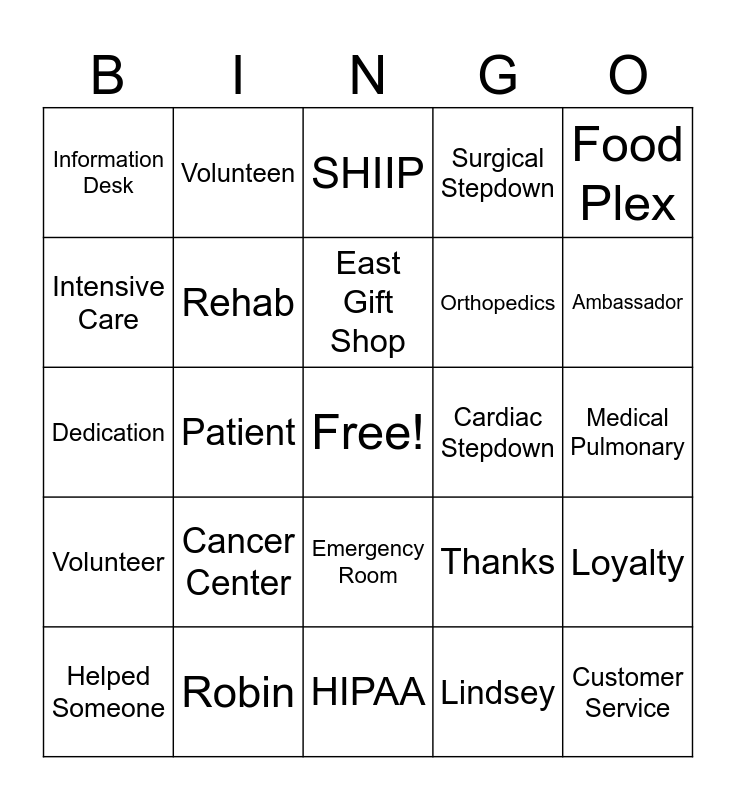 This bingo card has a free space and 39 words: Surgical Waiting Area, MercyOne, VicTouch, Rehab, Helped Someone, Emergency Room, East Gift Shop, Cardiovascular Intervention, Food Plex, Volunteer, Patient, Surgical Stepdown, Customer Service, Medical Pulmonary, Cardiac Stepdown, Cancer Center, Birth Center, Information Desk, Mission, Thanks, Intensive Care, HIPAA, Orthopedics, Ambassador, Rounding, Pet Therapy, Golf Cart, Snowbird, Volunteers Rock!, Volunteen, VicNet, Gilda's Club, SHIIP, Robin, Lindsey, Piano, Loyalty, Dedication and We Couldn't Have Picked Better Volunteers.