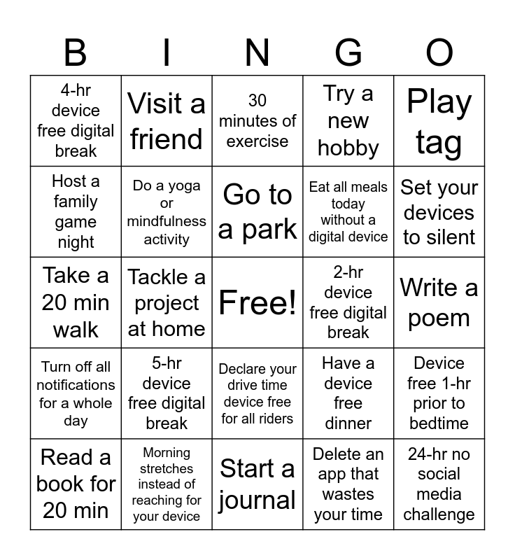 This bingo card has a free space and 24 words: 5-hr device free digital break, Morning stretches instead of reaching for your device, Go to a park, Read a book for 20 min, Play tag, 4-hr device free digital break, Host a family game night, Visit a friend, 2-hr device free digital break, Declare your drive time device free for all riders, Eat all meals today without a digital device, Take a 20 min walk, Have a device free dinner, Device free 1-hr prior to bedtime, Do a yoga or mindfulness activity, Delete an app that wastes your time, Write a poem, 30 minutes of exercise, Set your devices to silent, Tackle a project at home, 24-hr no social media challenge, Turn off all notifications for a whole day, Try a new hobby and Start a journal.