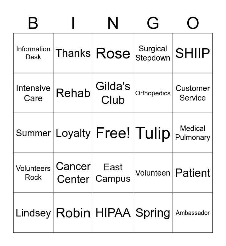 This bingo card has a free space and 39 words: Surgical Waiting Area, Fall, Daisy, Rehab, Lindsey, East Campus, Gilda's Club, Cardiovascular Intervention, SHIIP, Volunteers Rock, Loyalty, Surgical Stepdown, Ambassador, Medical Pulmonary, Tulip, Cancer Center, Golf Cart, Information Desk, Mission, Volunteen, Intensive Care, HIPAA, Orthopedics, Customer Service, Rounding, MercyOne, Birth Center, Petunia, Volunteer, Thanks, Pet Therapy, East Gift Shop, Rose, Robin, Spring, Piano, Patient, Summer and We Couldn't Have Picked Better Volunteers.