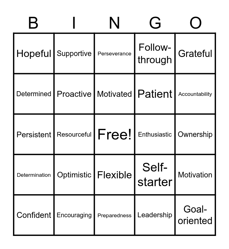 This bingo card has a free space and 24 words: Optimistic, Encouraging, Motivated, Confident, Grateful, Hopeful, Determined, Supportive, Enthusiastic, Flexible, Patient, Persistent, Self-starter, Motivation, Proactive, Leadership, Ownership, Perseverance, Accountability, Resourceful, Goal-oriented, Determination, Follow-through and Preparedness.