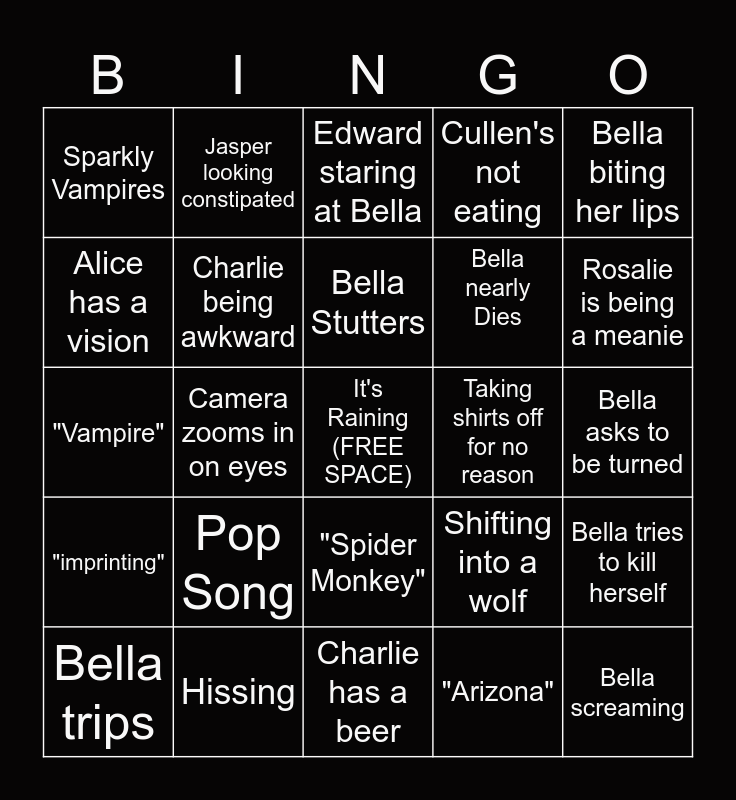 This bingo card has a free space and 24 words: Pop Song, Hissing, Bella Stutters, Bella trips, Bella biting her lips, Sparkly Vampires, Alice has a vision, Jasper looking constipated, Taking shirts off for no reason, "Spider Monkey", Bella nearly Dies, "Vampire", Shifting into a wolf, Bella tries to kill herself, Charlie being awkward, "Arizona", Bella asks to be turned, Edward staring at Bella, Rosalie is being a meanie, Camera zooms in on eyes, Bella screaming, "imprinting", Cullen's not eating and Charlie has a beer.