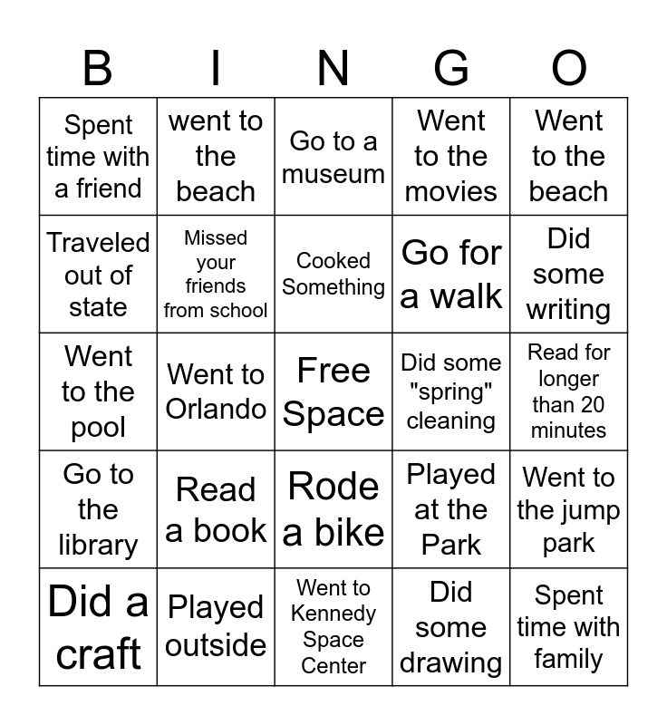 This bingo card has a free space and 24 words: Read a book, Played outside, Cooked Something, Did a craft, Went to the beach, Spent time with a friend, Traveled out of state, went to the beach, Did some "spring" cleaning, Rode a bike, Go for a walk, Went to the pool, Played at the Park, Went to the jump park, Missed your friends from school, Did some drawing, Read for longer than 20 minutes, Go to a museum, Did some writing, Went to Orlando, Spent time with family, Go to the library, Went to the movies and Went to Kennedy Space Center.