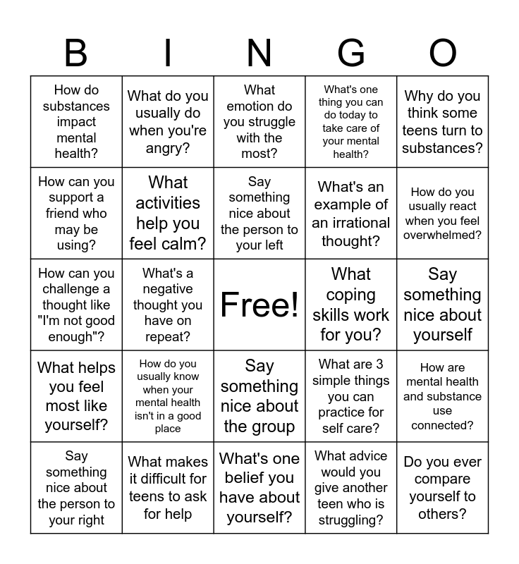 This bingo card has a free space and 24 words: How do you usually know when your mental health isn't in a good place, What makes it difficult for teens to ask for help, Say something nice about the person to your left, Say something nice about the person to your right, Why do you think some teens turn to substances?, How do substances impact mental health?, How can you support a friend who may be using?, What do you usually do when you're angry?, What coping skills work for you?, Say something nice about the group, What's an example of an irrational thought?, How can you challenge a thought like "I'm not good enough"?, What are 3 simple things you can practice for self care?, How are mental health and substance use connected?, What activities help you feel calm?, What advice would you give another teen who is struggling?, Say something nice about yourself, What emotion do you struggle with the most?, How do you usually react when you feel overwhelmed?, What's a negative thought you have on repeat?, Do you ever compare yourself to others?, What helps you feel most like yourself?, What's one thing you can do today to take care of your mental health? and What's one belief you have about yourself?.
