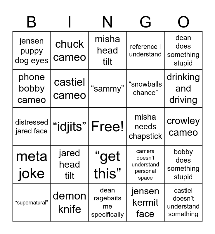 This bingo card has a free space and 24 words: jared head tilt, demon knife, “sammy”, “supernatural”, dean does something stupid, jensen puppy dog eyes, phone bobby cameo, chuck cameo, misha needs chapstick, “get this”, “snowballs chance”, distressed jared face, camera doesn’t understand personal space, bobby does something stupid, castiel cameo, jensen kermit face, crowley cameo, misha head tilt, drinking and driving, “idjits”, castiel doesn’t understand something, meta joke, reference i understand and dean ragebaits me specifically.