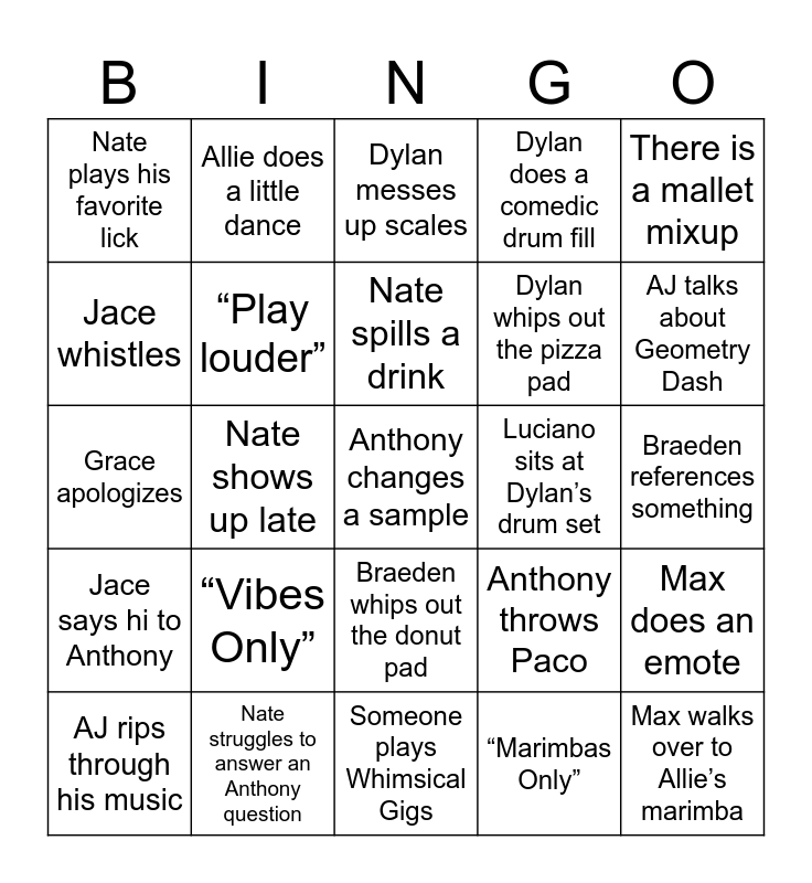 This bingo card has 25 words: “Vibes Only”, Someone plays Whimsical Gigs, Nate spills a drink, AJ rips through his music, There is a mallet mixup, Nate plays his favorite lick, Jace whistles, Allie does a little dance, Luciano sits at Dylan’s drum set, Braeden whips out the donut pad, Dylan whips out the pizza pad, Grace apologizes, Anthony throws Paco, Max does an emote, “Play louder”, Max walks over to Allie’s marimba, Braeden references something, Dylan messes up scales, AJ talks about Geometry Dash, Nate shows up late, Anthony changes a sample, Nate struggles to answer an Anthony question, Jace says hi to Anthony, Dylan does a comedic drum fill and “Marimbas Only”.