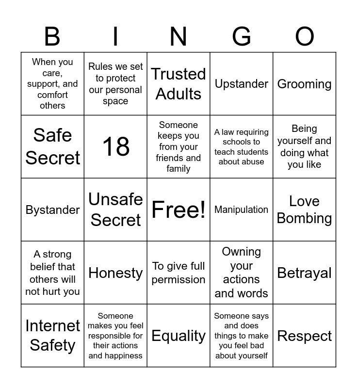 This bingo card has a free space and 24 words: Honesty, Someone makes you feel responsible for their actions and happiness, Someone keeps you from your friends and family, Internet Safety, Grooming, When you care, support, and comfort others, Safe Secret, Rules we set to protect our personal space, Manipulation, To give full permission, A law requiring schools to teach students about abuse, Bystander, Owning your actions and words, Betrayal, 18, Someone says and does things to make you feel bad about yourself, Love Bombing, Trusted Adults, Being yourself and doing what you like, Unsafe Secret, Respect, A strong belief that others will not hurt you, Upstander and Equality.