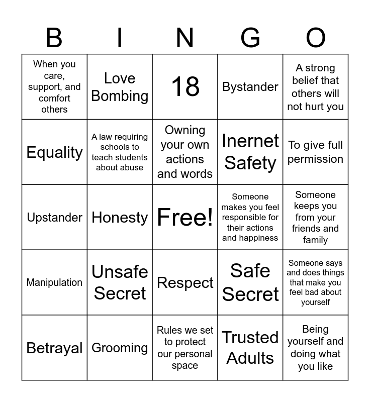 This bingo card has a free space and 24 words: Unsafe Secret, Grooming, Owning your own actions and words, Betrayal, A strong belief that others will not hurt you, When you care, support, and comfort others, Equality, Love Bombing, Someone makes you feel responsible for their actions and happiness, Respect, Inernet Safety, Upstander, Safe Secret, Someone says and does things that make you feel bad about yourself, A law requiring schools to teach students about abuse, Trusted Adults, Someone keeps you from your friends and family, 18, To give full permission, Honesty, Being yourself and doing what you like, Manipulation, Bystander and Rules we set to protect our personal space.