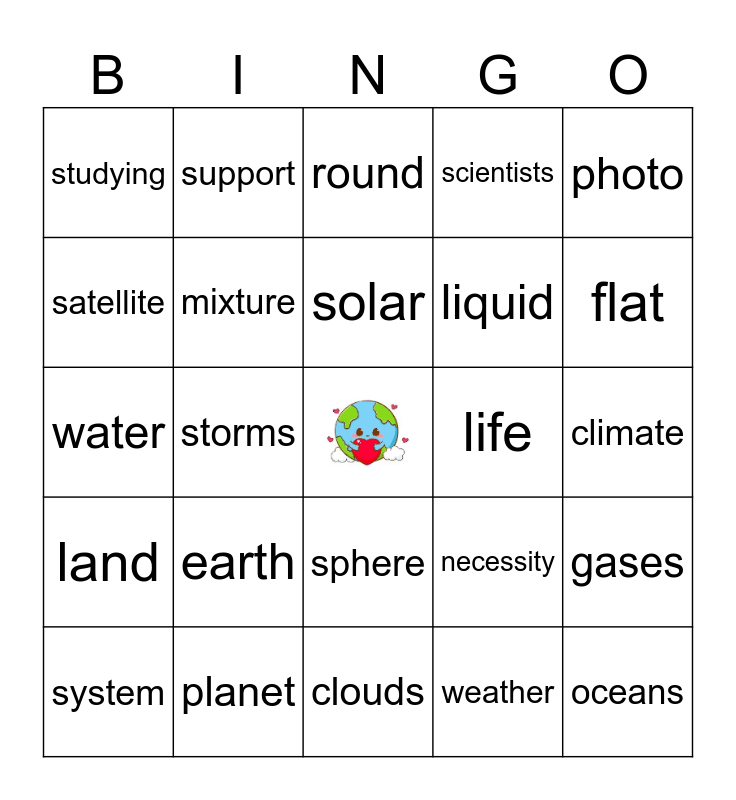 This bingo card has a free space and 24 words: earth, planet, solar, system, photo, studying, satellite, support, life, sphere, liquid, water, necessity, gases, mixture, weather, climate, round, flat, storms, oceans, land, scientists and clouds.