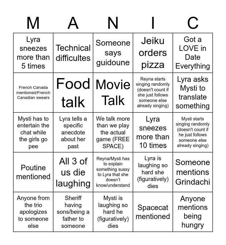 This bingo card has a free space and 35 words: Reyna is thirsty, Mysti is thirsty, Lyra is thirsty, Food talk, Reyna/Mysti has to explain something sussy to Lyra that she doesn’t know/understand, Jeiku orders pizza, French Canada mentioned/French Canadian swears, TV Show Talk, Movie Talk, New York or New York-related stuff mentioned, Mysti has to entertain the chat while the girls go pee, Got a LOVE in Date Everything, Got a FRIENDS in Date Everything, Got a HATE in Date Everything, Lyra sneezes more than 5 times, Lyra sneezes more than 10 times, Spacecat mentioned, Lyra tells a specific anecdote about her past, Poutine mentioned, Anyone mentions being hungry, Lyra is laughing so hard she (figuratively) dies, Anyone from the trio apologizes to someone else, Someone mentions Grindachi, Sheriff having sons/being a father to someone, Someone says guidoune, Lyra asks Mysti to translate something, Reyna blanks out, Lyra starts singing randomly (doesn't count if she just follows someone else already singing), Reyna starts singing randomly (doesn't count if she just follows someone else already singing), Mysti starts singing randomly (doesn't count if he just follows someone else already singing), Reyna is laughing so hard she (figuratively) dies, Mysti is laughing so hard he (figuratively) dies, All 3 of us die laughing, Technical difficultes and Lyra goes 'SIX SEEEEVEN' (might as well count that as a freebie XD).