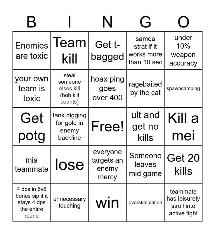 This bingo card has a free space and 24 words: lose, unnecessary touching, hoax ping goes over 400, 4 dps in 6v6 bonus sip if it stays 4 dps the entire round, under 10% weapon accuracy, Enemies are toxic, your own team is toxic, Team kill, ult and get no kills, everyone targets an enemy mercy, ragebaited by the cat, Get potg, Someone leaves mid game, Get 20 kills, steal someone elses kill (bob kill counts), overstimulation, Kill a mei, Get t-bagged, spawncamping, tank digging for gold in enemy backline, teammate has leisurely stroll into active fight, mia teammate, samoa strat if it works more than 10 sec and win.