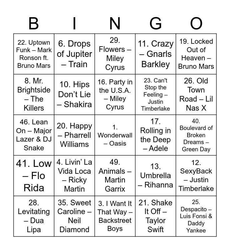 This bingo card has 51 words: Free!, 1. Wonderwall – Oasis, 2. 100 Years – Five for Fighting, 3. I Want It That Way – Backstreet Boys, 4. Livin’ La Vida Loca – Ricky Martin, 5. Bye Bye Bye – *NSYNC, 6. Drops of Jupiter – Train, 7. Hey Ya! – OutKast, 8. Mr. Brightside – The Killers, 9. Yeah! – Usher, 10. Hips Don’t Lie – Shakira, 11. Crazy – Gnarls Barkley, 12. SexyBack – Justin Timberlake, 13. Umbrella – Rihanna, 14. Viva La Vida – Coldplay, 15. I Gotta Feeling – Black Eyed Peas, 16. Party in the U.S.A. – Miley Cyrus, 17. Rolling in the Deep – Adele, 18. Call Me Maybe – Carly Rae Jepsen, 19. Locked Out of Heaven – Bruno Mars, 20. Happy – Pharrell Williams, 21. Shake It Off – Taylor Swift, 22. Uptown Funk – Mark Ronson ft. Bruno Mars, 23. Can't Stop the Feeling – Justin Timberlake, 24. Shape of You – Ed Sheeran, 25. Despacito – Luis Fonsi & Daddy Yankee, 26. Old Town Road – Lil Nas X, 27. Blinding Lights – The Weeknd, 28. Levitating – Dua Lipa, 29. Flowers – Miley Cyrus, 30. As It Was – Harry Styles, 31. Cruel Summer – Taylor Swift, 32. Watermelon Sugar – Harry Styles, 33. Shut Up and Dance – Walk the Moon, 34. Sugar – Maroon 5, 35. Sweet Caroline – Neil Diamond, 36. Don’t Stop Believin’ – Journey, 37. Friends in Low Places – Garth Brooks, 38. Wagon Wheel – Darius Rucker, 39. All Summer Long – Kid Rock, 40. Boulevard of Broken Dreams – Green Day, 41. Low – Flo Rida, 42. Poker Face – Lady Gaga, 43. Wake Me Up – Avicii, 44. Titanium – David Guetta ft. Sia, 45. Clarity – Zedd ft. Foxes, 46. Lean On – Major Lazer & DJ Snake, 47. Don’t You Worry Child – Swedish House Mafia, 48. Levels – Avicii, 49. Animals – Martin Garrix and 50. One More Time – Daft Punk.