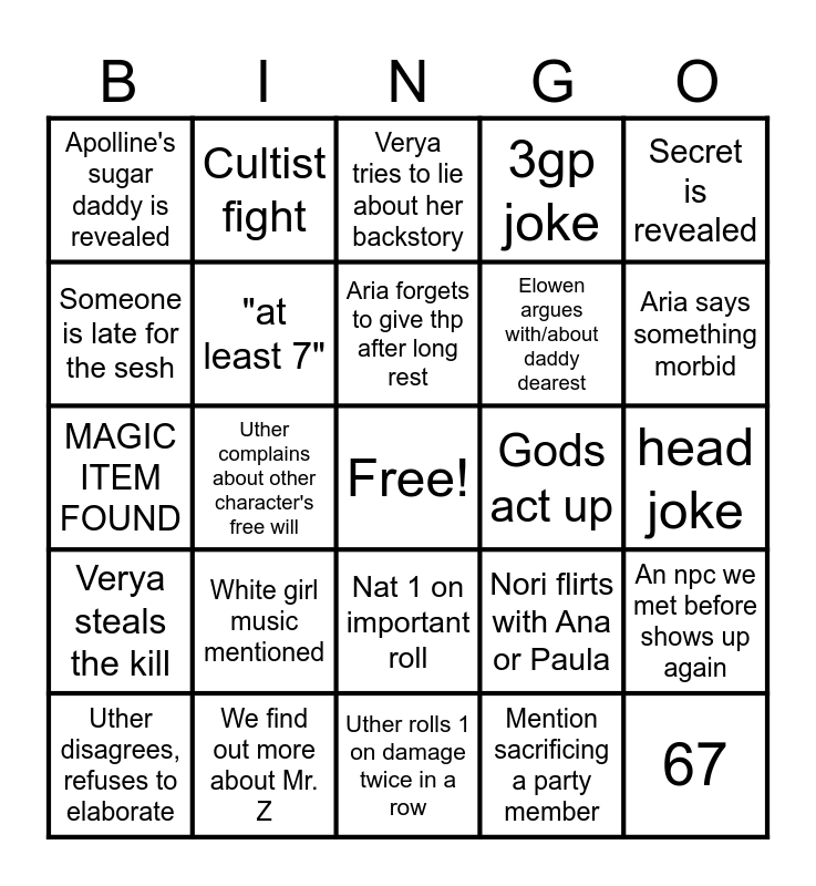 This bingo card has a free space and 24 words: Uther disagrees, refuses to elaborate, White girl music mentioned, Aria forgets to give thp after long rest, Mention sacrificing a party member, Secret is revealed, Apolline's sugar daddy is revealed, Cultist fight, Verya tries to lie about her backstory, Gods act up, head joke, MAGIC ITEM FOUND, "at least 7", Nori flirts with Ana or Paula, An npc we met before shows up again, Someone is late for the sesh, We find out more about Mr. Z, Uther rolls 1 on damage twice in a row, 3gp joke, Aria says something morbid, Verya steals the kill, Uther complains about other character's free will, Nat 1 on important roll, Elowen argues with/about daddy dearest and 67.