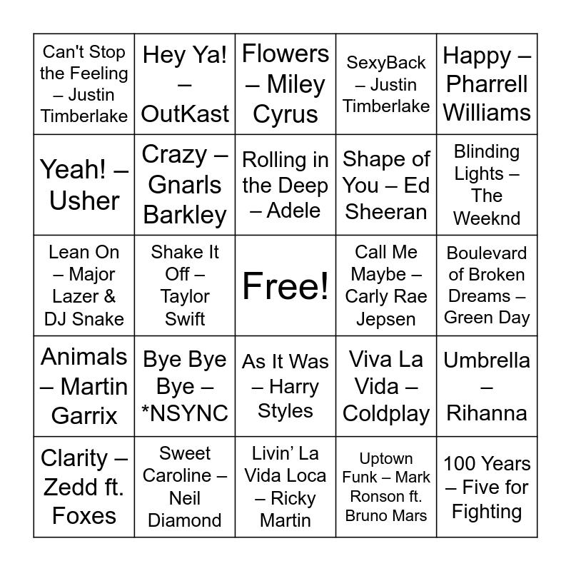 This bingo card has a free space and 50 words: Wonderwall – Oasis, 100 Years – Five for Fighting, I Want It That Way – Backstreet Boys, Livin’ La Vida Loca – Ricky Martin, Bye Bye Bye – *NSYNC, Drops of Jupiter – Train, Hey Ya! – OutKast, Mr. Brightside – The Killers, Yeah! – Usher, Hips Don’t Lie – Shakira, Crazy – Gnarls Barkley, SexyBack – Justin Timberlake, Umbrella – Rihanna, Viva La Vida – Coldplay, I Gotta Feeling – Black Eyed Peas, Party in the U.S.A. – Miley Cyrus, Rolling in the Deep – Adele, Call Me Maybe – Carly Rae Jepsen, Locked Out of Heaven – Bruno Mars, Happy – Pharrell Williams, Shake It Off – Taylor Swift, Uptown Funk – Mark Ronson ft. Bruno Mars, Can't Stop the Feeling – Justin Timberlake, Shape of You – Ed Sheeran, Despacito – Luis Fonsi & Daddy Yankee, Old Town Road – Lil Nas X, Blinding Lights – The Weeknd, Levitating – Dua Lipa, Flowers – Miley Cyrus, As It Was – Harry Styles, Cruel Summer – Taylor Swift, Watermelon Sugar – Harry Styles, Shut Up and Dance – Walk the Moon, Sugar – Maroon 5, Sweet Caroline – Neil Diamond, Don’t Stop Believin’ – Journey, Friends in Low Places – Garth Brooks, Wagon Wheel – Darius Rucker, All Summer Long – Kid Rock, Boulevard of Broken Dreams – Green Day, Low – Flo Rida, Poker Face – Lady Gaga, Wake Me Up – Avicii, Titanium – David Guetta ft. Sia, Clarity – Zedd ft. Foxes, Lean On – Major Lazer & DJ Snake, Don’t You Worry Child – Swedish House Mafia, Levels – Avicii, Animals – Martin Garrix and One More Time – Daft Punk.