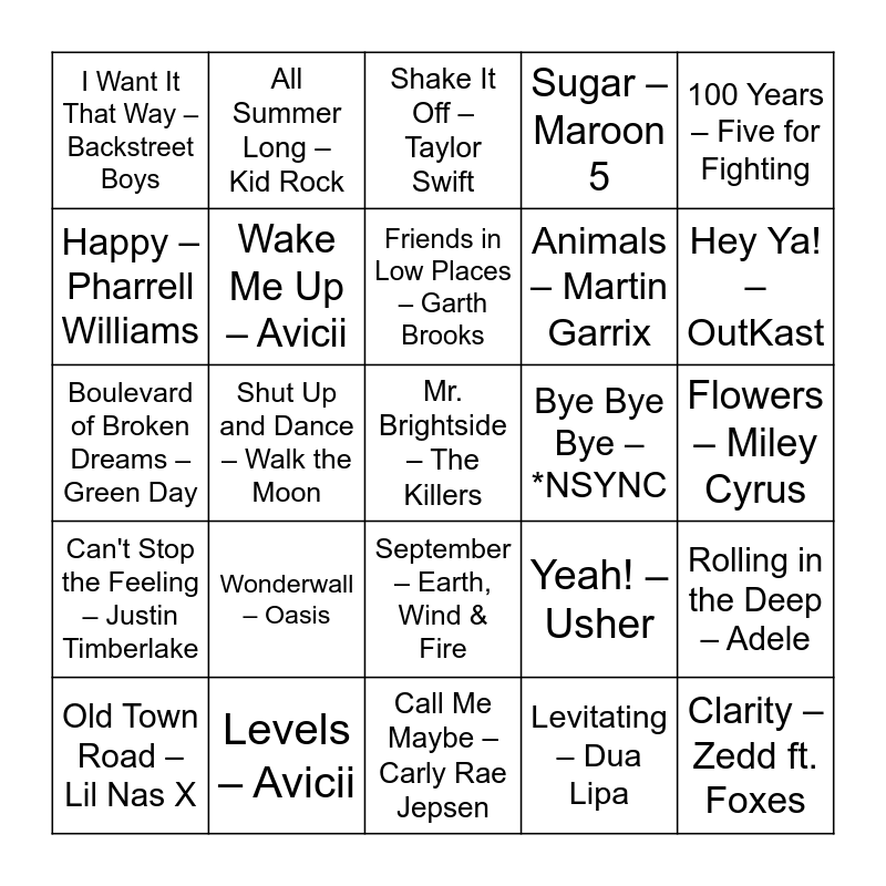 This bingo card has 51 words: Free!, Mr. Brightside – The Killers, Titanium – David Guetta ft. Sia, Call Me Maybe – Carly Rae Jepsen, Wonderwall – Oasis, Poker Face – Lady Gaga, All Summer Long – Kid Rock, Shape of You – Ed Sheeran, Happy – Pharrell Williams, Low – Flo Rida, Wake Me Up – Avicii, Sugar – Maroon 5, Rolling in the Deep – Adele, Yeah! – Usher, Wagon Wheel – Darius Rucker, Cruel Summer – Taylor Swift, Friends in Low Places – Garth Brooks, Bye Bye Bye – *NSYNC, Blinding Lights – The Weeknd, 100 Years – Five for Fighting, Shut Up and Dance – Walk the Moon, Levitating – Dua Lipa, I Want It That Way – Backstreet Boys, Animals – Martin Garrix, Party in the U.S.A. – Miley Cyrus, Clarity – Zedd ft. Foxes, Hey Ya! – OutKast, SexyBack – Justin Timberlake, Old Town Road – Lil Nas X, Shake It Off – Taylor Swift, Umbrella – Rihanna, Don’t Stop Believin’ – Journey, Despacito – Luis Fonsi & Daddy Yankee, I Gotta Feeling – Black Eyed Peas, Watermelon Sugar – Harry Styles, Levels – Avicii, Hips Don’t Lie – Shakira, Viva La Vida – Coldplay, Drops of Jupiter – Train, Lean On – Major Lazer & DJ Snake, Flowers – Miley Cyrus, Can't Stop the Feeling – Justin Timberlake, Sweet Caroline – Neil Diamond, Locked Out of Heaven – Bruno Mars, As It Was – Harry Styles, Crazy – Gnarls Barkley, Boulevard of Broken Dreams – Green Day, One More Time – Daft Punk, Don’t You Worry Child – Swedish House Mafia, September – Earth, Wind & Fire and Take Me Home, Country Roads – John Denver.