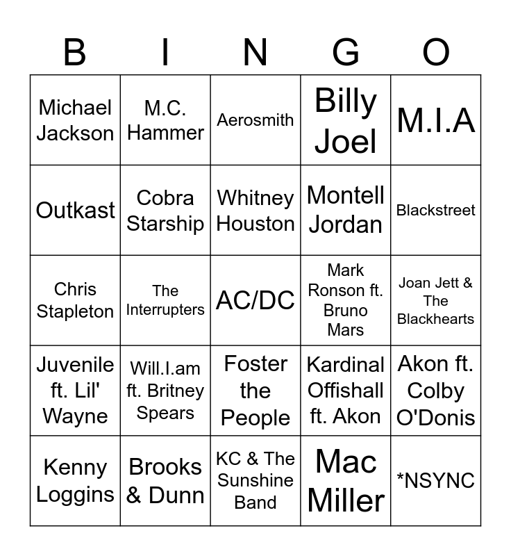 This bingo card has 36 words: Backstreet Boys, Sir Mix-A-Lot, Global Deejays, Cobra Starship, Kardinal Offishall ft. Akon, Juvenile ft. Lil' Wayne, Whitney Houston, Pomplamoose ft. Sarah Dugas, M.I.A, Dirty Heads & Rome, The Interrupters, Billy Joel, Donna Summer, Mark Ronson ft. Bruno Mars, Blackstreet, Michael Jackson, *NSYNC, Will.I.am ft. Britney Spears, AC/DC, Aerosmith, Joan Jett & The Blackhearts, Akon ft. Colby O'Donis, Brooks & Dunn, Kenny Loggins, KC & The Sunshine Band, M.C. Hammer, Chris Stapleton, Dierks Bentley, Montell Jordan, Outkast, The Clash, Kiesza, Mac Miller, Foster the People, Lil Dicky ft. Chris Brown and The Interrupters ft. Tim Armstrong.