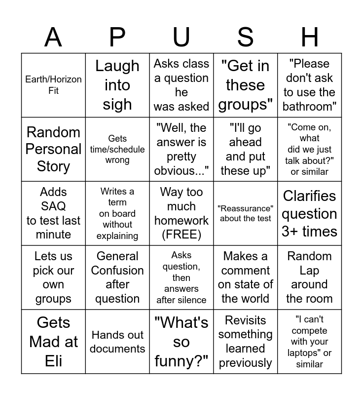 This bingo card has a free space and 25 words: General Confusion after question, "What's so funny?", "Well, the answer is pretty obvious...", Gets Mad at Eli, "Please don't ask to use the bathroom", Earth/Horizon Fit, Random Personal Story, Laugh into sigh, "Reassurance" about the test, Asks question, then answers after silence, "I'll go ahead and put these up", Adds SAQ to test last minute, Makes a comment on state of the world, Random Lap around the room, Gets time/schedule wrong, Spells something wrong, Clarifies question 3+ times, Asks class a question he was asked, "Come on, what did we just talk about?" or similar, Writes a term on board without explaining, "I can't compete with your laptops" or similar, Hands out documents, Lets us pick our own groups, "Get in these groups" and Revisits something learned previously.
