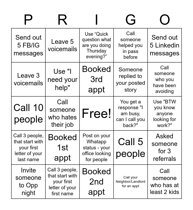 This bingo card has a free space and 25 words: Booked 1st appt, Booked 2nd appt, Booked 3rd appt, Invite someone to Opp night, Send out 5 Linkedin messages, Send out 5 FB/IG messages, Leave 3 voicemails, Leave 5 voicemails, You get a response "I am busy, can I call you back?", Post on your Whatapp status - your office looking for people, Someone replied to your posted story, Call 10 people, Call 5 people, Asked someone for 3 referrals, Use "I need your help", Use "Where the money?", Use "BTW you know anyone looking for work?", Use “Quick question what are you doing Thursday evening?”, Call someone who you have been avoiding, Call someone who hates their job, Call someone who has at least 2 kids, Call 3 people, that start with your first letter of your first name, Call 3 people, that start with your first letter of your last name, Call someone helped you in pass before and Call your Neighbor/Landlord for an appt.