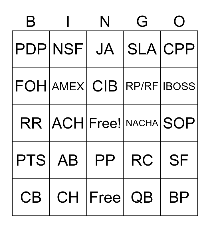 This bingo card has a free space and 24 words: AB, CH, CIB, CB, CPP, PDP, FOH, NSF, NACHA, PP, RP/RF, RR, RC, SF, AMEX, QB, SOP, JA, IBOSS, ACH, BP, PTS, SLA and Free.