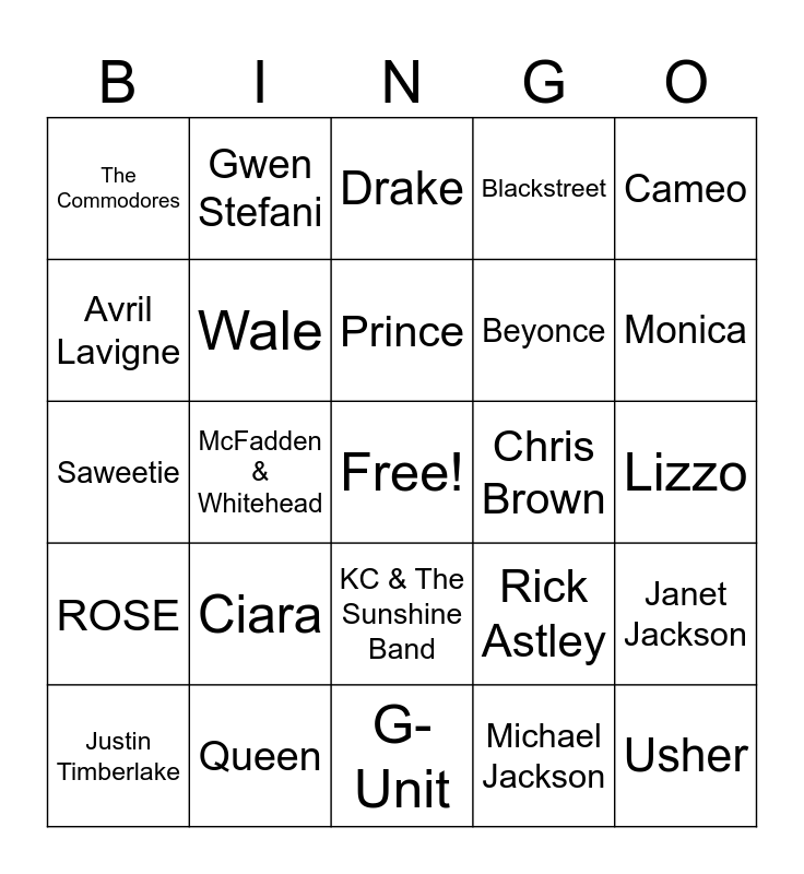 This bingo card has a free space and 26 words: KC & The Sunshine Band, Michael Jackson, Prince, Queen, Cameo, The Commodores, Avril Lavigne, Gwen Stefani, Lizzo, Rick Astley, Beyonce, Saweetie, Janet Jackson, Justin Timberlake, McFadden & Whitehead, Eminem, Blackstreet, ROSE, Drake, Usher, Monica, G-Unit, Chris Brown, Ciara, Wale and Eve.