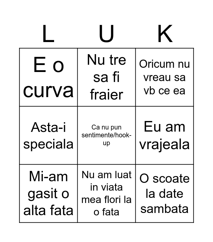 This bingo card has 9 words: Mi-am gasit o alta fata, Oricum nu vreau sa vb ce ea, Nu tre sa fi fraier, Asta-i speciala, E o curva, Eu am vrajeala, Ca nu pun sentimente/hook-up, O scoate la date sambata and Nu am luat in viata mea flori la o fata.