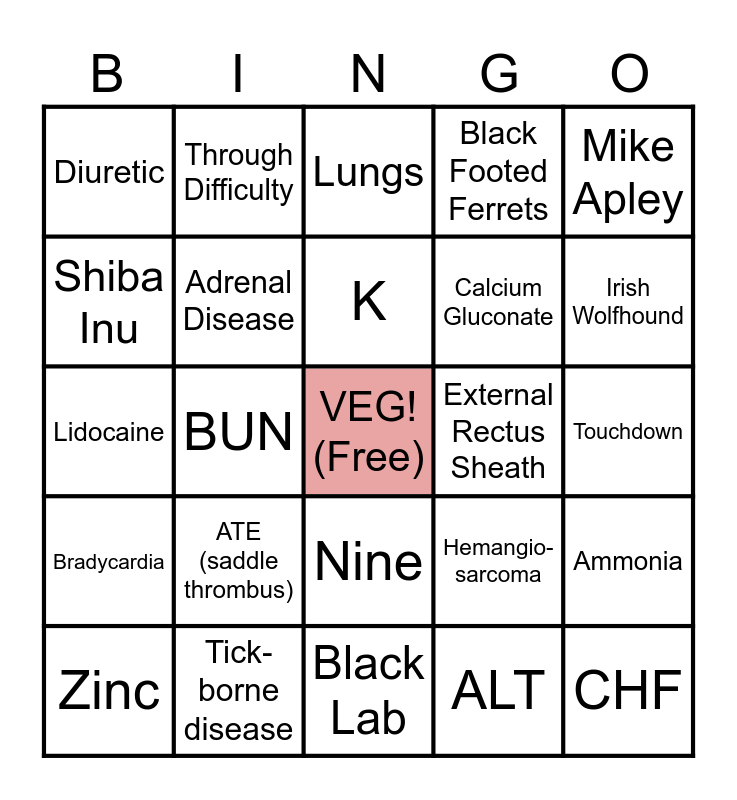 This bingo card has a free space and 34 words: Antifreeze, ALT, Positive Inotrope, Na & K, Bradycardia, Adrenal Disease, Mike Apley, Zinc, Through Difficulty, FMD, K, Lungs, Apnea, HCM, External Rectus Sheath, Irish Wolfhound, Tick-borne disease, Lidocaine, ATE (saddle thrombus), Hemangio-sarcoma, Nine, Low Ca, Diuretic, Touchdown, Black Lab, CHF, Black Footed Ferrets, Eosinophils, Calcium Gluconate, Shiba Inu, DCM, BUN, Ammonia and 12.