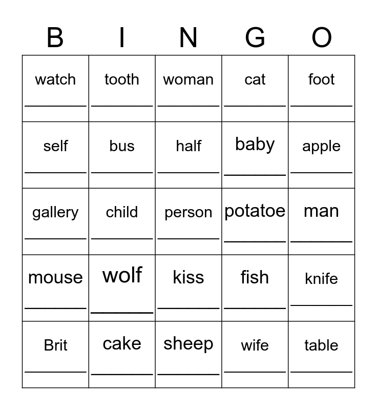 This bingo card has 25 words: wolf _____, sheep ______, half _______, Brit _______, foot _______, watch _______, self _______, tooth _______, potatoe ______, kiss ______, baby ______, gallery _______, fish ______, knife _______, bus _______, table _______, man ______, woman _______, apple _______, child _______, person _______, cake ______, mouse ______, cat _______ and wife _______.