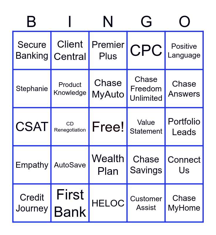This bingo card has a free space and 24 words: AutoSave, First Bank, Chase MyAuto, Credit Journey, Positive Language, Secure Banking, Stephanie, Client Central, Value Statement, Wealth Plan, Chase Freedom Unlimited, CSAT, Chase Savings, Connect Us, Product Knowledge, Customer Assist, Portfolio Leads, Premier Plus, Chase Answers, CD Renegotiation, Chase MyHome, Empathy, CPC and HELOC.