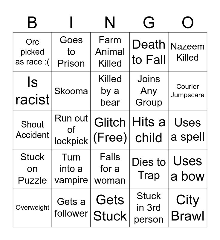 This bingo card has a free space and 24 words: Turn into a vampire, Gets a follower, Killed by a bear, Overweight, Nazeem Killed, Orc picked as race :(, Is racist, Goes to Prison, Hits a child, Falls for a woman, Joins Any Group, Shout Accident, Dies to Trap, Uses a bow, Skooma, Stuck in 3rd person, Uses a spell, Farm Animal Killed, Courier Jumpscare, Run out of lockpick, City Brawl, Stuck on Puzzle, Death to Fall and Gets Stuck.