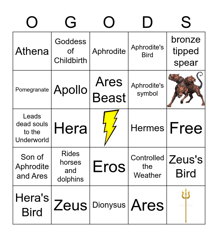 This bingo card has 4 images and 26 words: Zeus, Hades, Hera, Poseidon, Athena, Aphrodite, Apollo, Eros, Hermes, Dionysus, Free, Ares, Controlled the Weather, Son of Aphrodite and Ares, Rides horses and dolphins, bronze tipped spear, Leads dead souls to the Underworld, Goddess of War, Goddess of Childbirth, Aphrodite's symbol, Pomegranate, Aphrodite's Bird, Zeus's Bird, Hera's Bird, Ares Beast and Athena's Symbol.