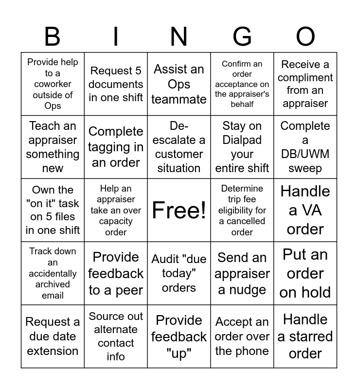This bingo card has a free space and 24 words: Provide feedback to a peer, Source out alternate contact info, De-escalate a customer situation, Request a due date extension, Receive a compliment from an appraiser, Provide help to a coworker outside of Ops, Teach an appraiser something new, Request 5 documents in one shift, Determine trip fee eligibility for a cancelled order, Audit "due today" orders, Stay on Dialpad your entire shift, Own the "on it" task on 5 files in one shift, Send an appraiser a nudge, Put an order on hold, Complete tagging in an order, Accept an order over the phone, Handle a VA order, Assist an Ops teammate, Complete a DB/UWM sweep, Help an appraiser take an over capacity order, Handle a starred order, Track down an accidentally archived email, Confirm an order acceptance on the appraiser's behalf and Provide feedback "up".