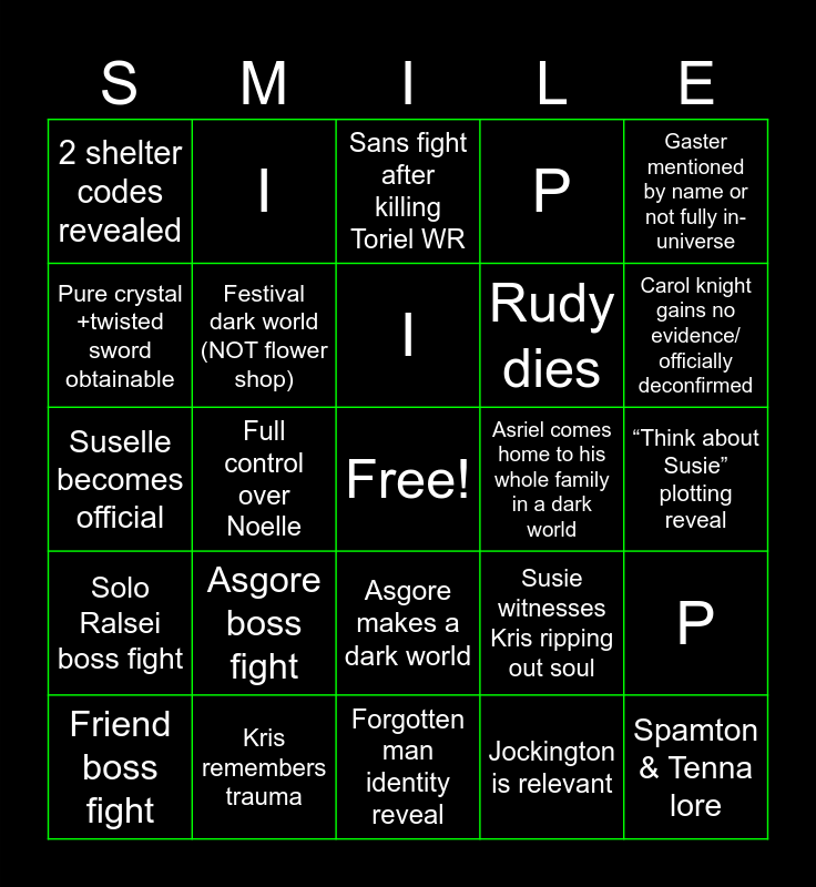 This bingo card has a free space and 29 words: Friend boss fight, WR Ralsei+Susie vs Kris+noelle, Full control over Noelle, Seam boss fight, 2 shelter codes revealed, Sans fight after killing Toriel WR, Festival dark world (NOT flower shop), Asgore boss fight, Asriel comes home to his whole family in a dark world, Kris remembers trauma, “Think about Susie” plotting reveal, Spamton & Tenna lore, Forgotten man identity reveal, Jockington is relevant, Carol knight gains no evidence/ officially deconfirmed, Gaster involvement in WR, Asgore makes a dark world, Solo Ralsei boss fight, Gaster mentioned by name or not fully in-universe, Suselle becomes official, Susie witnesses Kris ripping out soul, Susie involvement in WR, Rudy dies, Pure crystal +twisted sword obtainable, P, I, P, I and S.