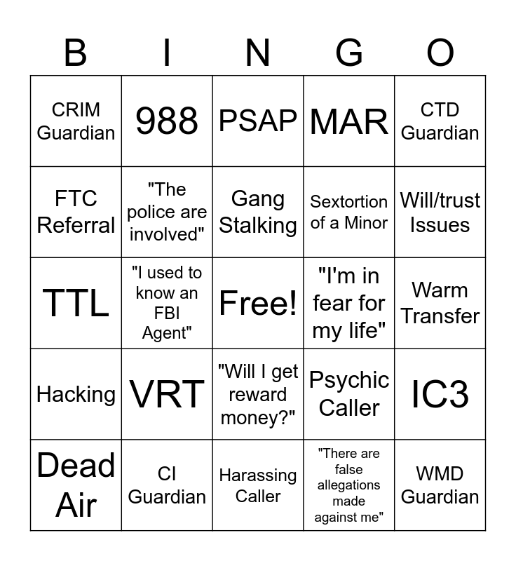 This bingo card has a free space and 24 words: Dead Air, VRT, Gang Stalking, "There are false allegations made against me", CTD Guardian, CRIM Guardian, 988, PSAP, "I'm in fear for my life", Warm Transfer, TTL, "The police are involved", Psychic Caller, IC3, FTC Referral, CI Guardian, Harassing Caller, MAR, Will/trust Issues, Hacking, "I used to know an FBI Agent", "Will I get reward money?", Sextortion of a Minor and WMD Guardian.