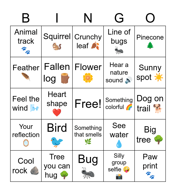 This bingo card has a free space and 25 words: Bird π¦, Bug π, Flower πΌ, Cool rock πͺ¨, Pinecone π², Animal track πΎ, Feather πͺΆ, Squirrel πΏ, Something colorful π, Something that smells πΏ, Hear a nature sound π, Feel the wind π¬, See water π§, Big tree π³, Fallen log πͺ΅, Trail marker π§, Dog on trail π, Crunchy leaf π, Sunny spot βοΈ, Heart shape β€οΈ, Paw print πΎ, Tree you can hug π³, Your reflection πͺ, Line of bugs π and Silly group selfie π€ͺπΈ.