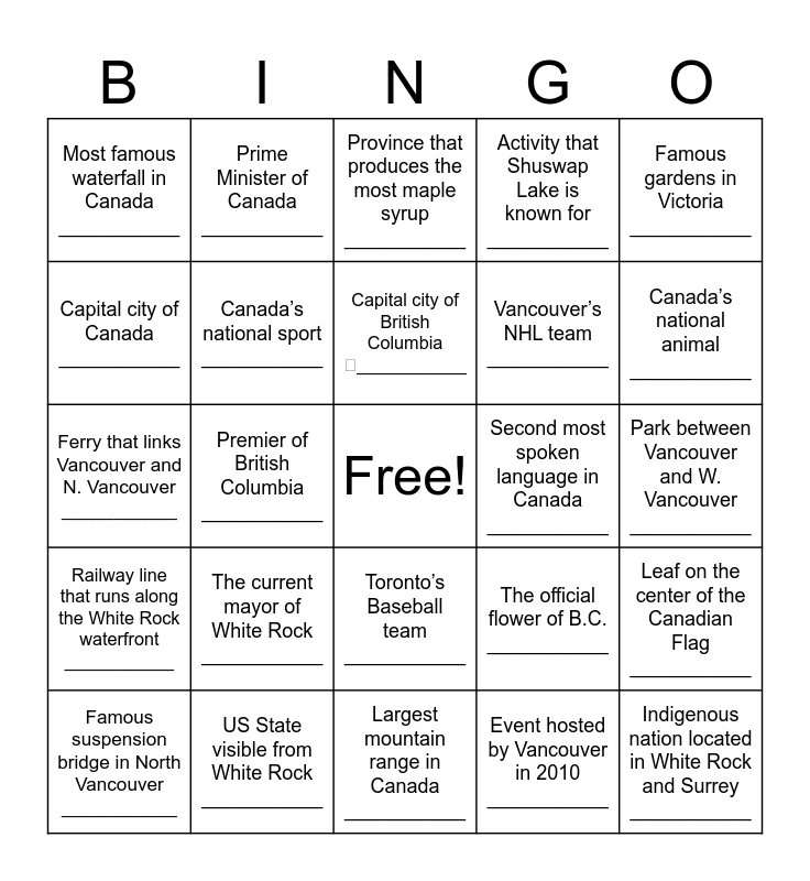 This bingo card has a free space and 24 words: The current mayor of White Rock ___________, US State visible from White Rock ___________, Capital city of British Columbia ␍___________, Famous suspension bridge in North Vancouver ___________, Famous gardens in Victoria ___________, Most famous waterfall in Canada ___________, Capital city of Canada ___________, Prime Minister of Canada ___________, Second most spoken language in Canada ___________, Toronto’s Baseball team ___________, Vancouver’s NHL team ___________, Ferry that links Vancouver and N. Vancouver ___________, The official flower of B.C. ___________, Leaf on the center of the Canadian Flag ___________, Canada’s national sport ___________, Event hosted by Vancouver in 2010 ___________, Park between Vancouver and W. Vancouver ___________, Province that produces the most maple syrup ___________, Canada’s national animal ___________, Premier of British Columbia ___________, Indigenous nation located in White Rock and Surrey ___________, Railway line that runs along the White Rock waterfront ___________, Activity that Shuswap Lake is known for ___________ and Largest mountain range in Canada ___________.