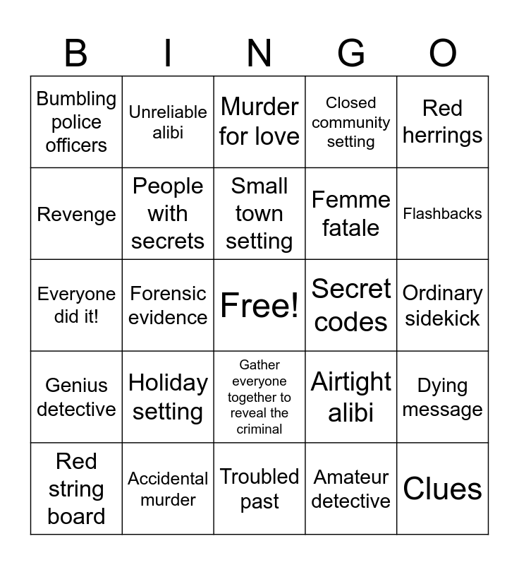 This bingo card has a free space and 39 words: Quirky detective, Fiendish plan, Small town setting, People with secrets, Red string board, Gather everyone together to reveal the criminal, Small town setting, Big city setting, Red herrings, Genius detective, Forensic evidence, Closed community setting, Clues, Ordinary sidekick, Secret codes, Holiday setting, Wrongful arrest, Bumbling police officers, "Where's the body?", Airtight alibi, Revenge, Troubled past, Femme fatale, Flashbacks, Suicide... or so we think!, Missing person, Locked room, Nosy reporter, Poison, Unreliable alibi, Fingerprints, No evidence left behind, Murder for love, Accidental murder, Amateur detective, Hidden room, Dying message, Everyone did it! and Race against the clock.