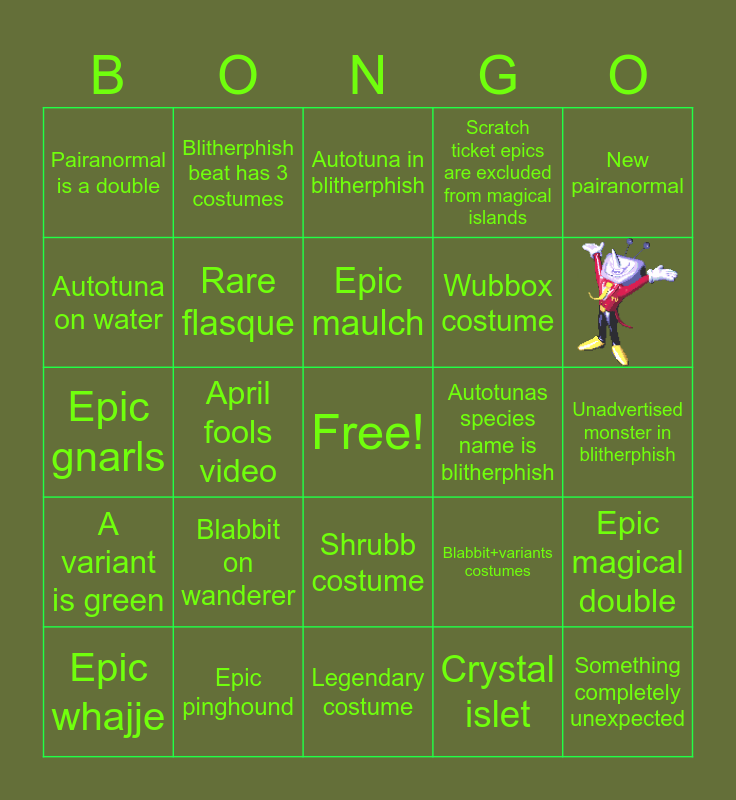 This bingo card has 1 images, a free space and 23 words: Blabbit on wanderer, Epic pinghound, Epic maulch, Epic whajje, New pairanormal, Pairanormal is a double, Autotuna on water, Blitherphish beat has 3 costumes, Autotunas species name is blitherphish, Shrubb costume, Wubbox costume, Epic gnarls, Blabbit+variants costumes, Epic magical double, Rare flasque, Crystal islet, Unadvertised monster in blitherphish, Autotuna in blitherphish, April fools video, Something completely unexpected, A variant is green, Scratch ticket epics are excluded from magical islands and Legendary costume.