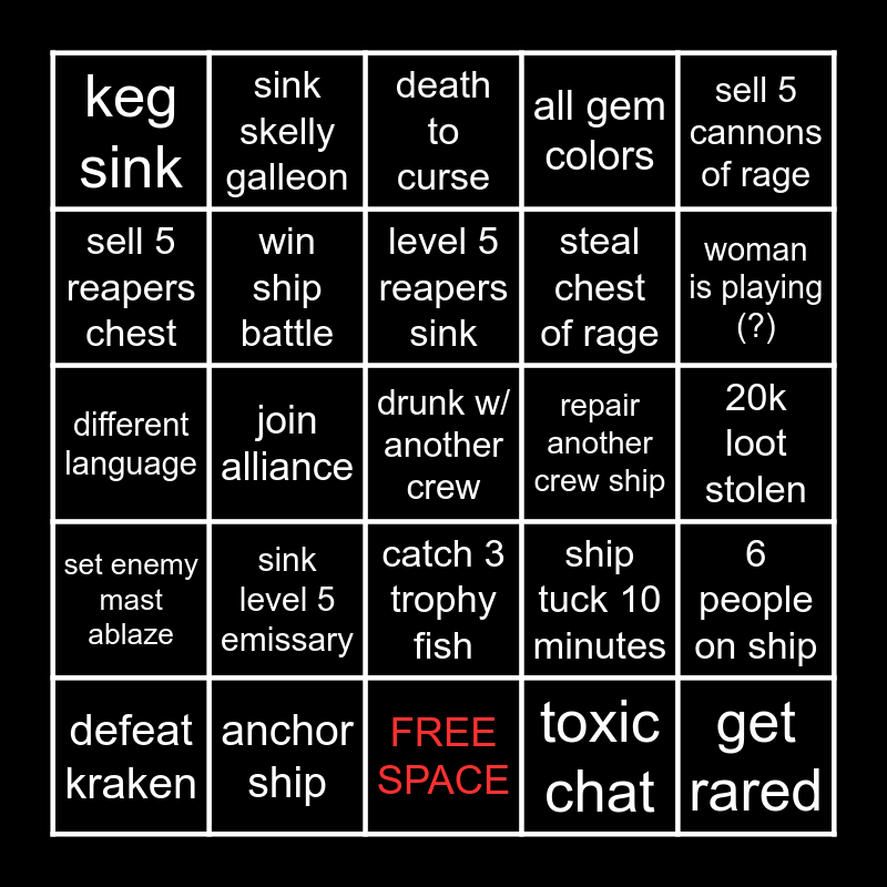 This bingo card has 25 words: sink level 5 emissary, FREE SPACE, level 5 reapers sink, defeat kraken, sell 5 cannons of rage, keg sink, sell 5 reapers chest, sink skelly galleon, repair another crew ship, catch 3 trophy fish, steal chest of rage, different language, ship tuck 10 minutes, 6 people on ship, win ship battle, get rared, 20k loot stolen, death to curse, woman is playing (?), join alliance, drunk w/ another crew, anchor ship, set enemy mast ablaze, all gem colors and toxic chat.