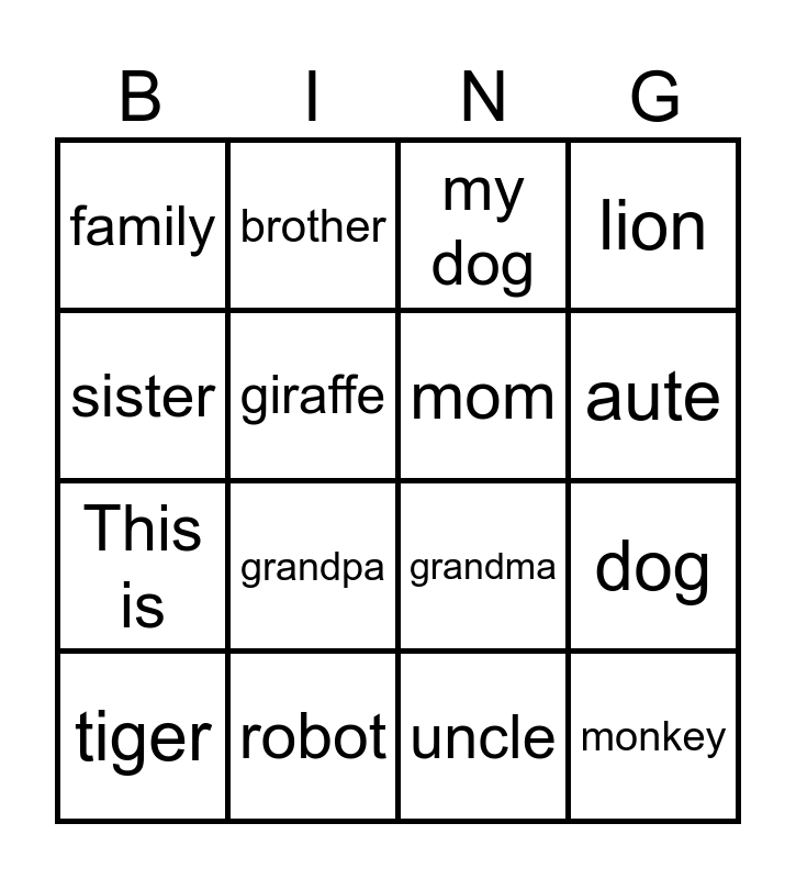 This bingo card has 16 words: robot, dog, my dog, family, This is, brother, grandma, uncle, sister, giraffe, tiger, lion, grandpa, aute, mom and monkey.