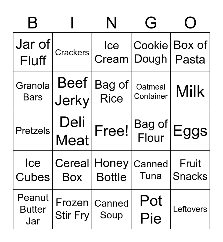 This bingo card has a free space and 25 words: Cereal Box, Canned Soup, Bag of Rice, Peanut Butter Jar, Box of Pasta, Jar of Fluff, Granola Bars, Crackers, Bag of Flour, Honey Bottle, Oatmeal Container, Pretzels, Canned Tuna, Fruit Snacks, Beef Jerky, Opened Condiments, Eggs, Ice Cream, Milk, Deli Meat, Leftovers, Frozen Stir Fry, Ice Cubes, Cookie Dough and Pot Pie.