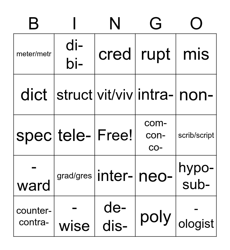 This bingo card has a free space and 78 words: graph, photo, cred, aud/audi, ped/pod, port, hydr, phon, bio, chron, log/logue, astr, rupt, meter/metr, therm, dict, geo, grad/gres, ject, scrib/script, mal, mis, spec, vit/viv, struct, tract, vac, bene/bon, vis/vid, ir-, non-, im- in- il-, de- dis-, anti-, counter- contra-, com- con- co-, -ance -ence -ness, -er -or -ian -ist, -ology, -ologist, -phobia, -phobe, -arium -orium, -ment, mono- uni-, di- bi-, tri-, pre- fore- ante-, post-, hyper- super-, hypo- sub-, tele-, neo-, ab-, -able -ible, -ic, -ly, trans-, auto-, inter-, intra-, ex-, peri-, sym- syn-, ambi-, -ate, -en, -ize, -ward, -wise, -ful, -less, multi-, min- micro-, poly, psych, retro and zoo.