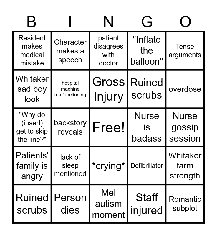 This bingo card has a free space and 26 words: *crying*, Staff injured, Gross Injury, Person dies, Tense arguments, Resident makes medical mistake, Whitaker sad boy look, Character makes a speech, Nurse gossip session, Defibrillator, Ruined scrubs, "Why do (insert) get to skip the line?", Whitaker farm strength, Ruined scrubs, backstory reveals, political commentary, "Inflate the balloon", Patients' family is angry, patient disagrees with doctor, Romantic subplot, overdose, Mel autism moment, Nurse is badass, lack of sleep mentioned, hospital machine malfunctioning and issues at other hospital.