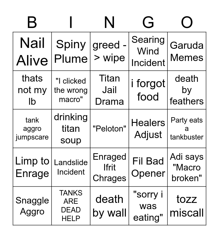 This bingo card has a free space and 24 words: Landslide Incident, TANKS ARE DEAD HELP, Titan Jail Drama, Snaggle Aggro, Garuda Memes, Nail Alive, thats not my lb, Spiny Plume, Healers Adjust, Enraged Ifrit Chrages, i forgot food, tank aggro jumpscare, Fil Bad Opener, Adi says "Macro broken", "I clicked the wrong macro", "sorry i was eating", Party eats a tankbuster, greed -> wipe, death by feathers, drinking titan soup, tozz miscall, Limp to Enrage, Searing Wind Incident and death by wall.